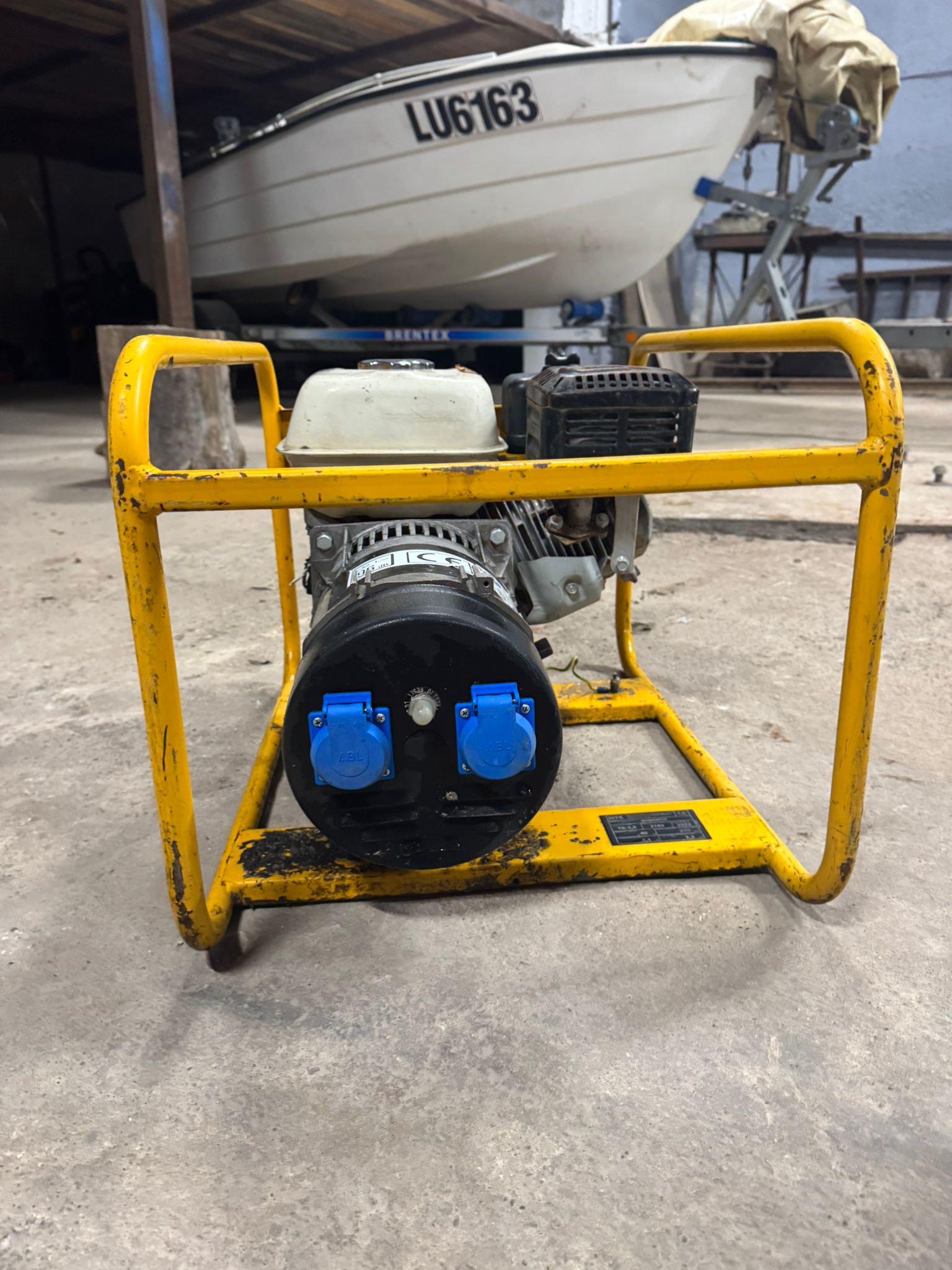 Kompakts lietots ģenerators ar Honda GX200 motoru, manuālu iedarbināšanu un divām 230 V rozetēm.